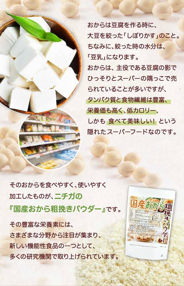 | 商品名 | 国産おから粗挽きパウダー(粗粉末)国産大豆100% |