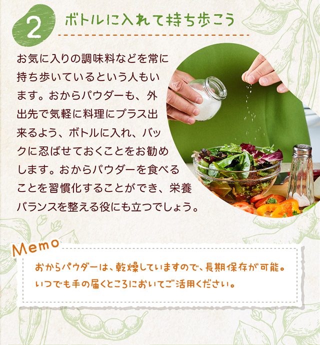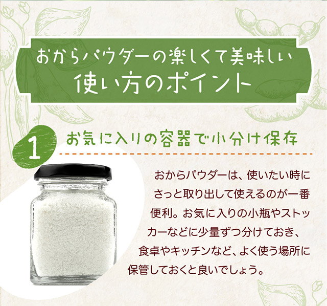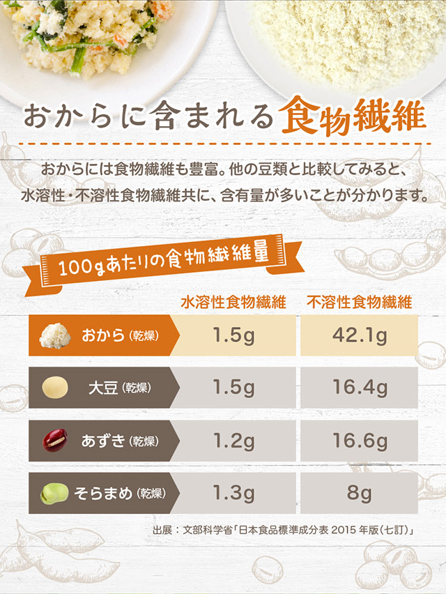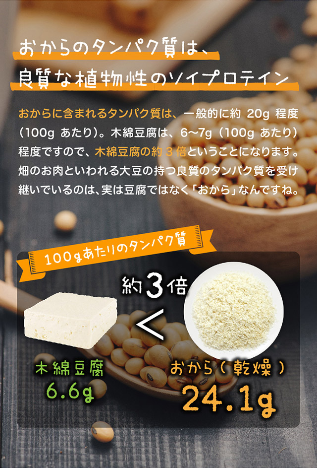 | お召し上がり方 | 卯の花煮、コロッケ、てんぷら粉、お好み焼き、ハンバーグ、グラタン、ドーナツやクッキーの材料など、様々な料理にご使用いただけます。 |