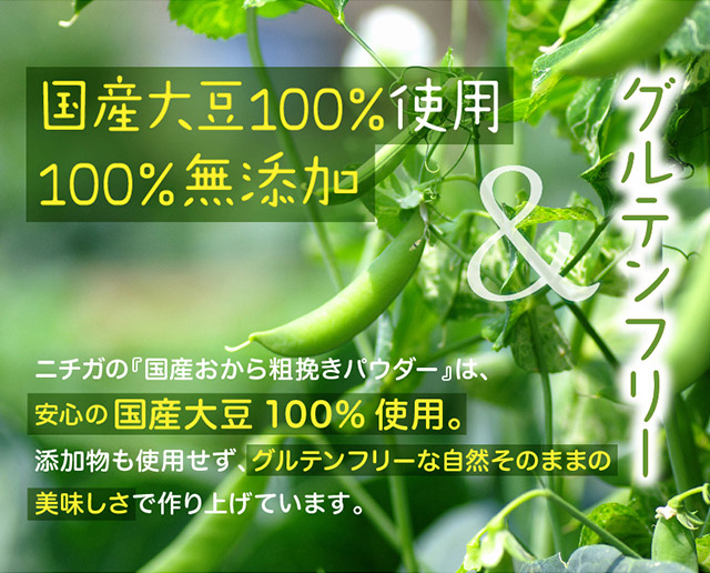 | 国産おから粗挽きパウダー(日本) | 国産大豆(遺伝子組み換えでない) | 日本 |