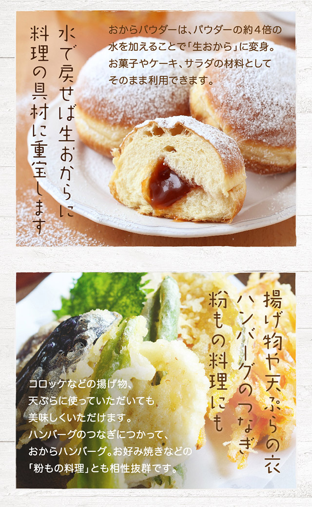 定番のうの花煮やコロッケ、てんぷらの衣、ドーナツやクッキーの材料など、様々な料理にご使用いただけます。
