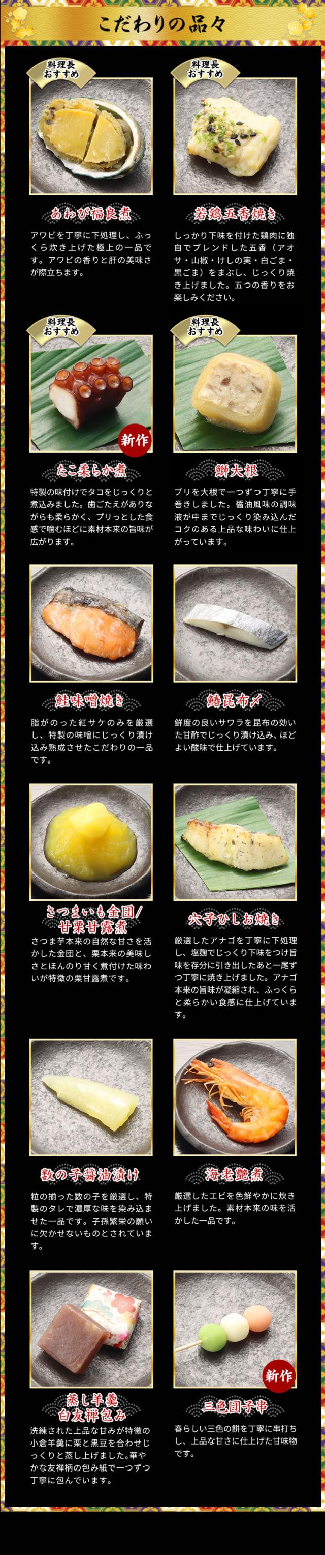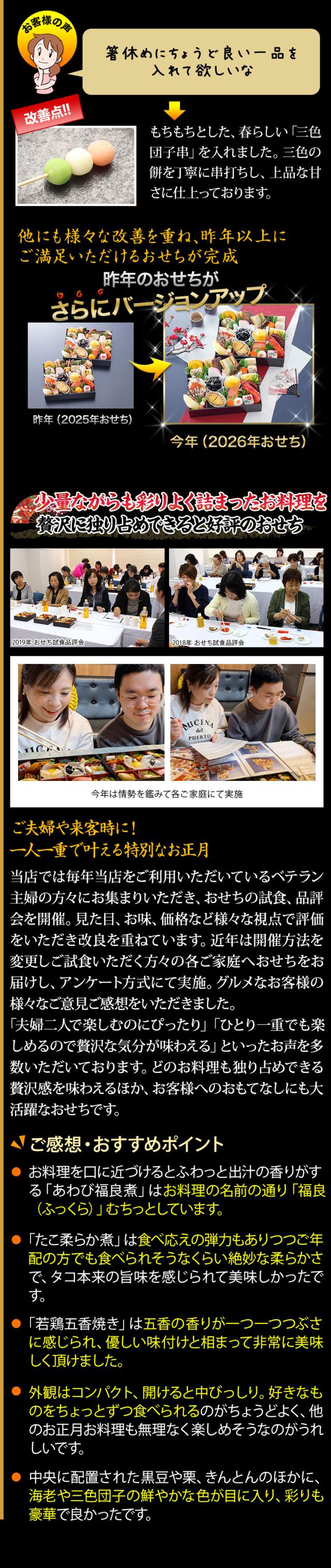 同じ内容の二段重が2組セットになっているため、ご夫婦や2人でお正月を過ごすのに最適な個食おせちです。昨年ご好評いただいた品々はそのままに、今年は新作料理として、特製の味付けでタコをじっくりと煮込み、プリっとした食感で噛むほどに素材本来の旨味が広がる「たこ柔らか煮」や、鮮度の良いホタルイカを旨味の効いたダシで炊き上げた「蛍烏賊含め煮」が加わり、さらに豪華になりました。また、一段がお一人様用なので、急な来客があった際にもお客様用としてすぐに出せる、使い勝手の良いおせちです。
