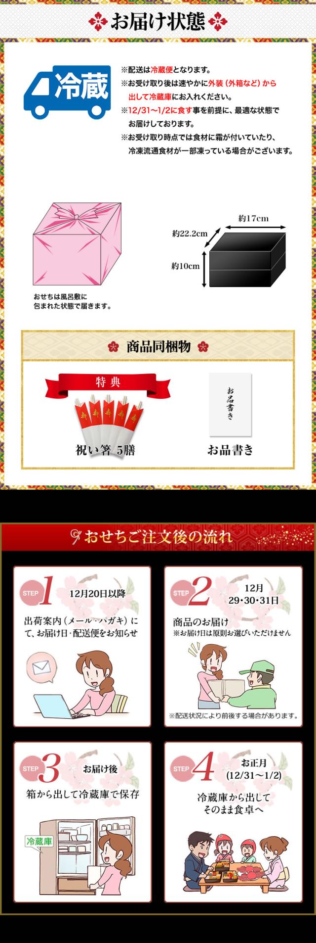 - 元旦で一人づつ頂きました。とても綺麗なおせちでしたが… 来年も注文するということはないと思いました。
