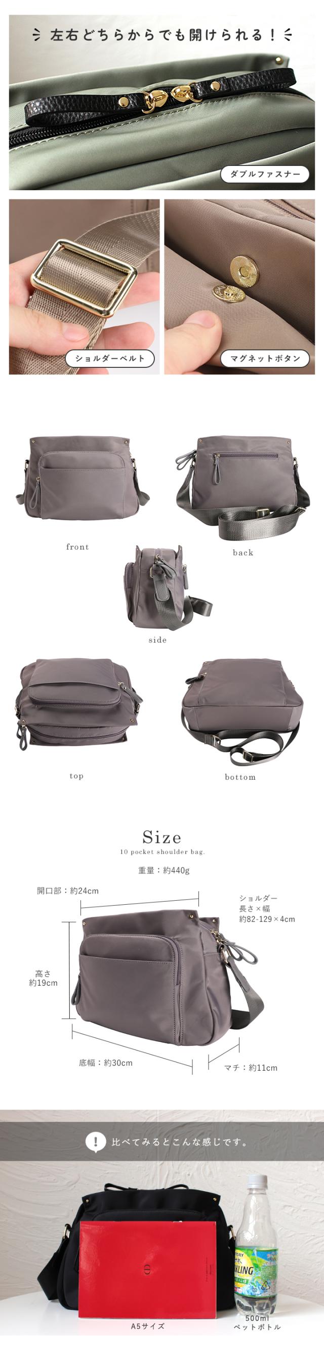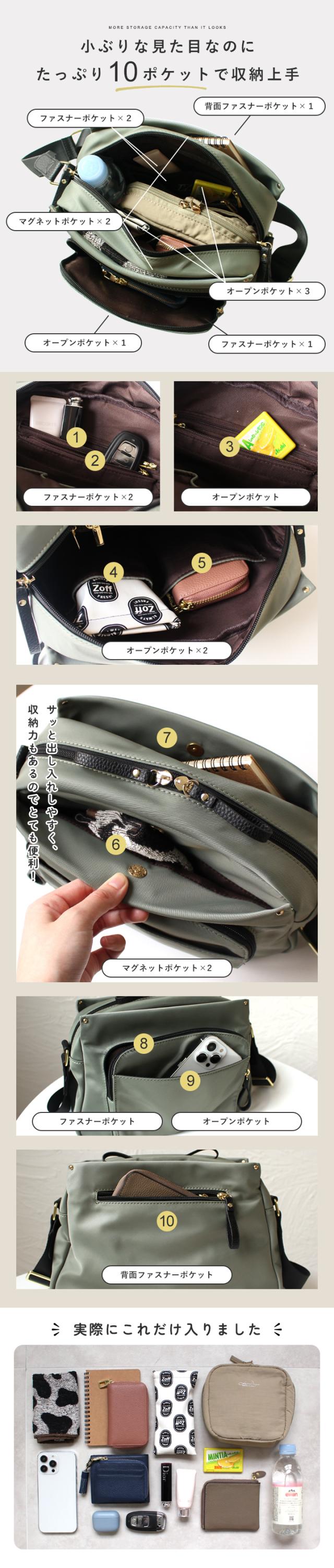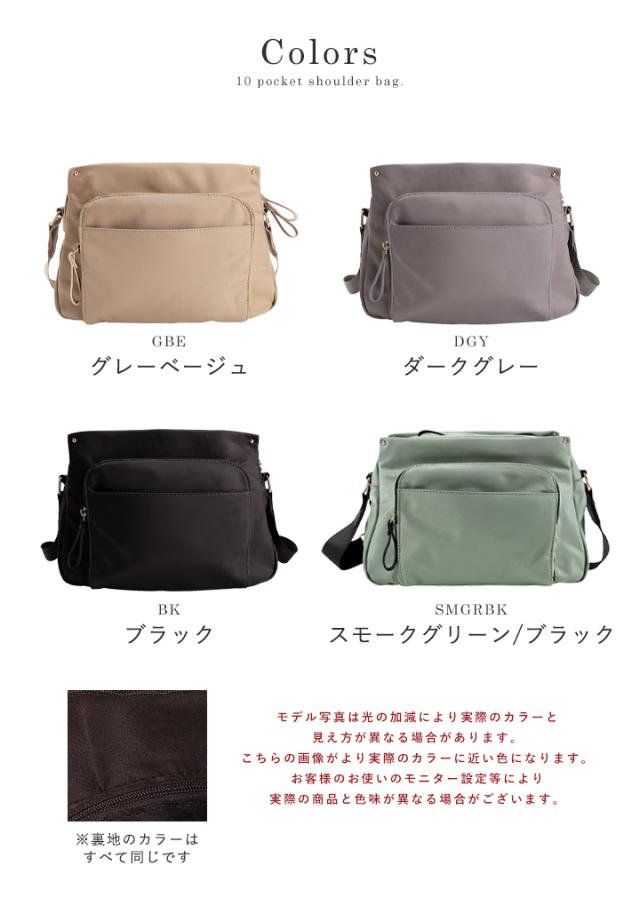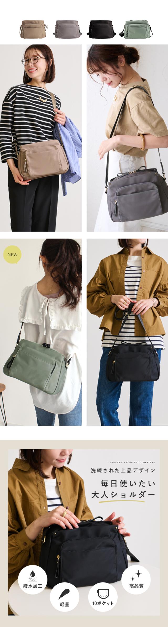 ショルダーバッグ レディース 撥水ナイロン 異素材 ナイロンバッグ はっ水 防水 斜め掛け 肩掛け かわいい 軽い 軽量 多収納 大容量 10ポケット ポケット たくさん おでかけ シンプル 無地 大人 LIZDAYS リズデイズ スタイルオンバック【lz-153r】