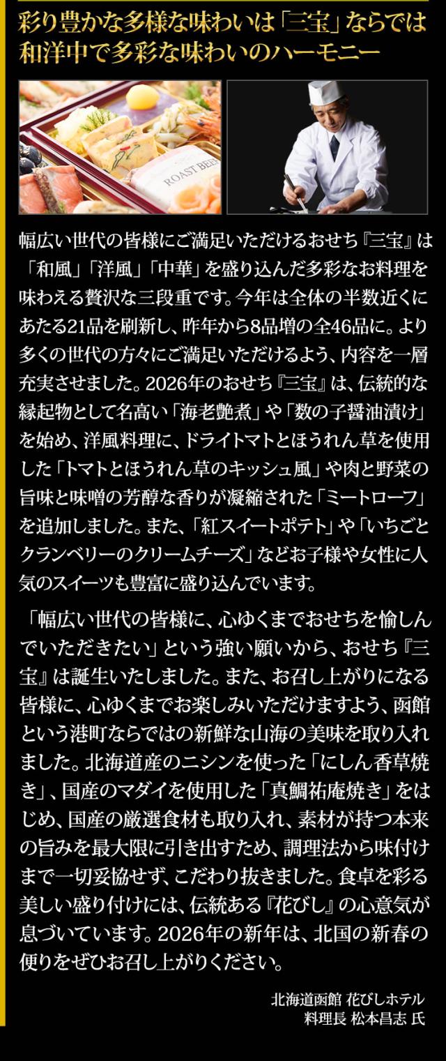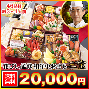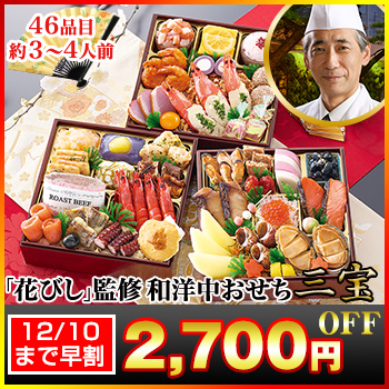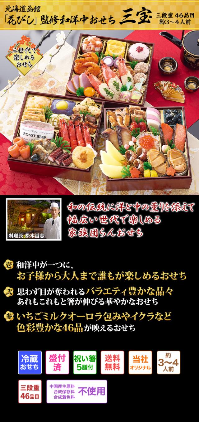 6.5寸三段和洋中おせち 【46品目・3〜4人前】 北海道函館「花びし」監修和洋中おせち 三宝【送料無料】 冷蔵おせち 冷蔵 おせち お節 御節