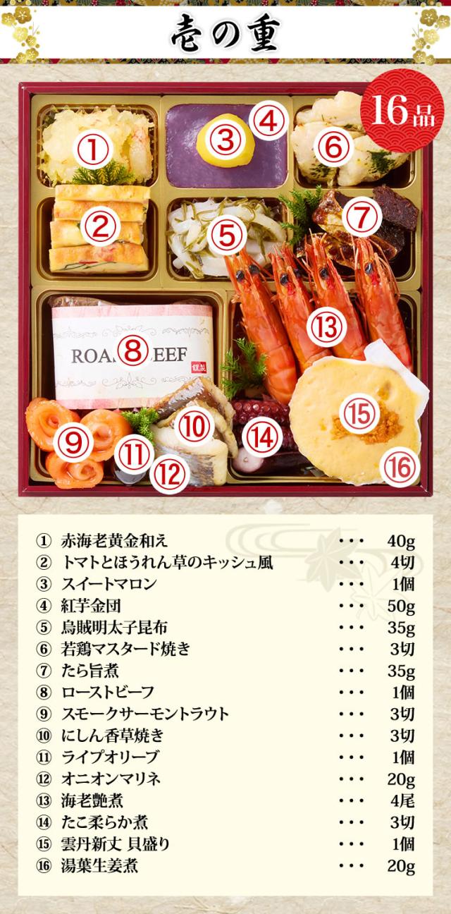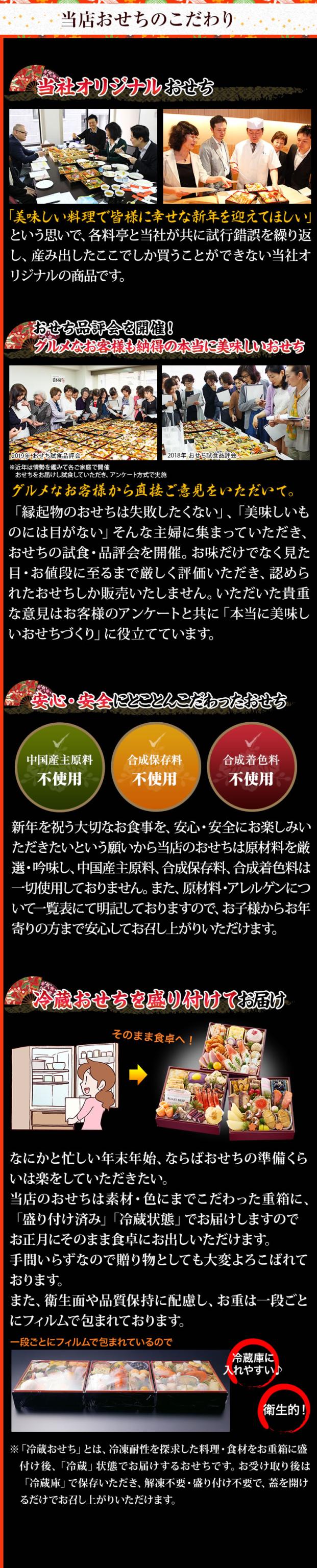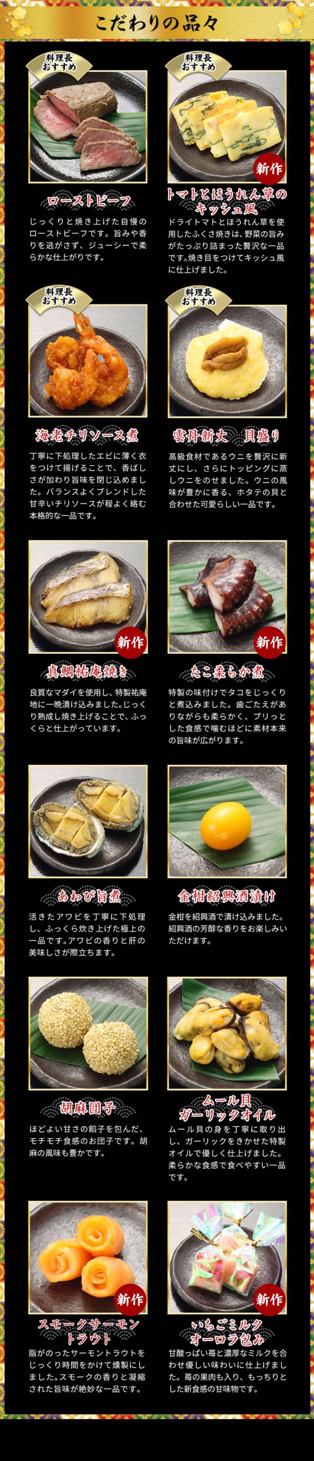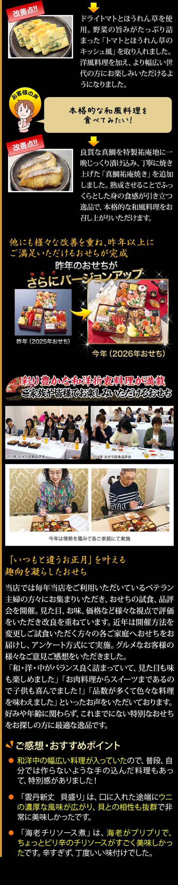 - 楽しみにしていたお節料理でしたが、 口に合わなくて、半分以上食べれませんでした。 主人も子供達も食べてくれなくて、 とても残念でした。
