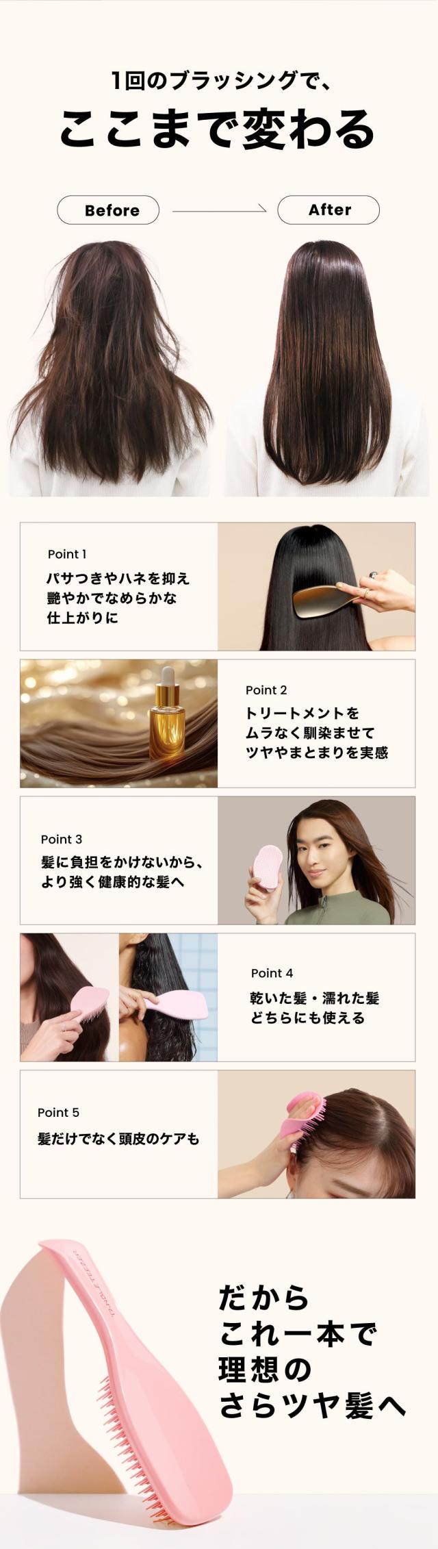 髪の絡まりを瞬時に解きほぐすヘアケアブラシ。特許取得の長短2段構造ブラシが、ブラッシングによる髪への負担を最小限に抑え、サラサラ艶やかな美しい髪へ導きます。特に傷みやすい濡れ髪の状態でも、毛先までやさしく解きほぐすことができます。インバス、アウトバスどちらにも使用でき、毎日のブラッシングに最適です。