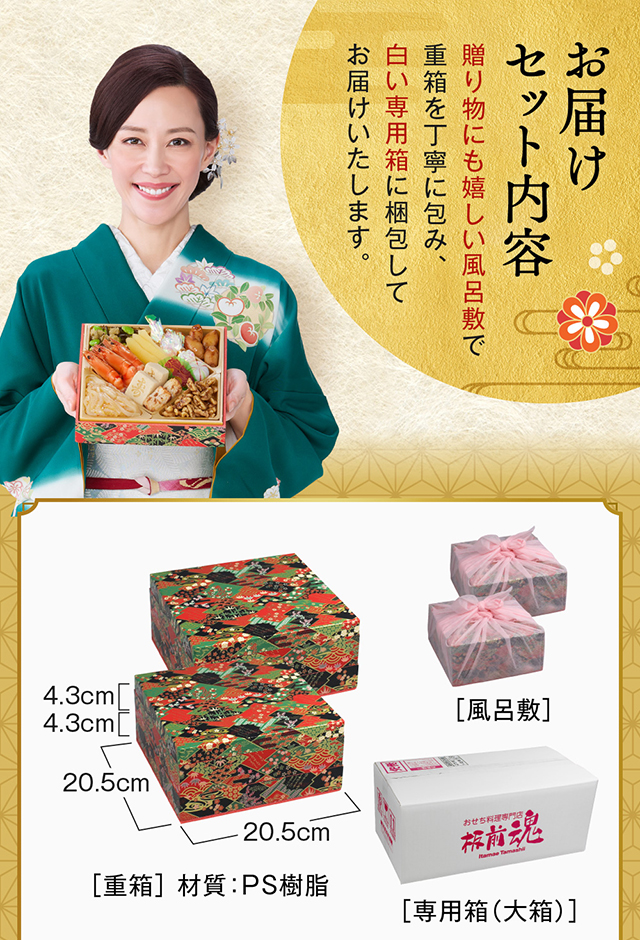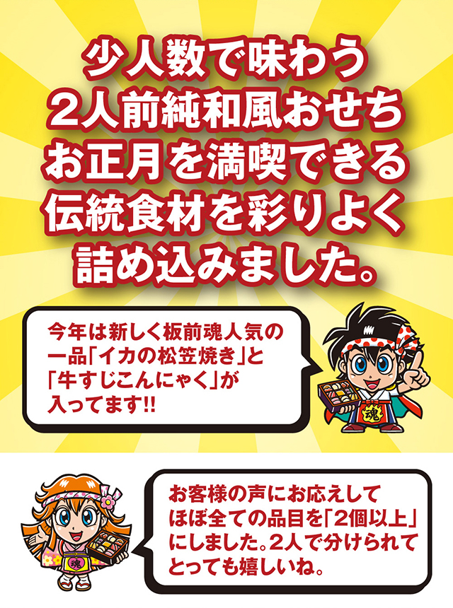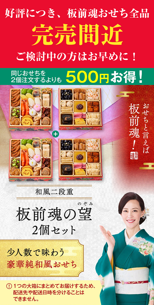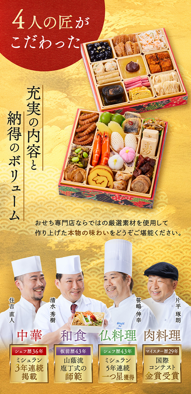 板前魂のおせち料理は、函館、小樽 、仙台、 築地 、山梨、金沢、浜松、 京都 、下関、 博多 、鹿児島など日本や海外の産地をまわり厳選した食材を使用し、有名店やホテルで修行したシェフや繁盛店を営む板長といった4人の匠が監修しています。