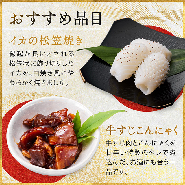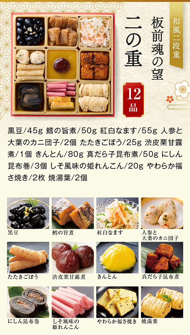 【一の重】たこの旨煮/若桃甘露煮/にしんの黒酢南蛮/くるみ田作り/味付数の子/イカの松笠焼き/寿高野豆腐/子持昆布山海和え/有頭海老の艶煮/花餅白梅/花餅紅梅/牛すじこんにゃく/照焼帆立/伊達巻/小鯛西京焼/国産豚肉ごぼう巻