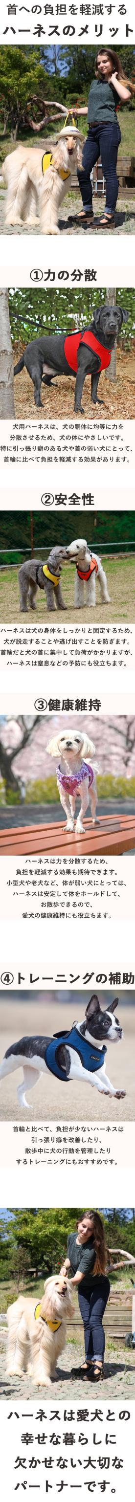 首輪と違って胸全体でリードの引っ張りを受け止めるので、気管への圧迫を防ぎ、シニア犬・小型犬にも安心。