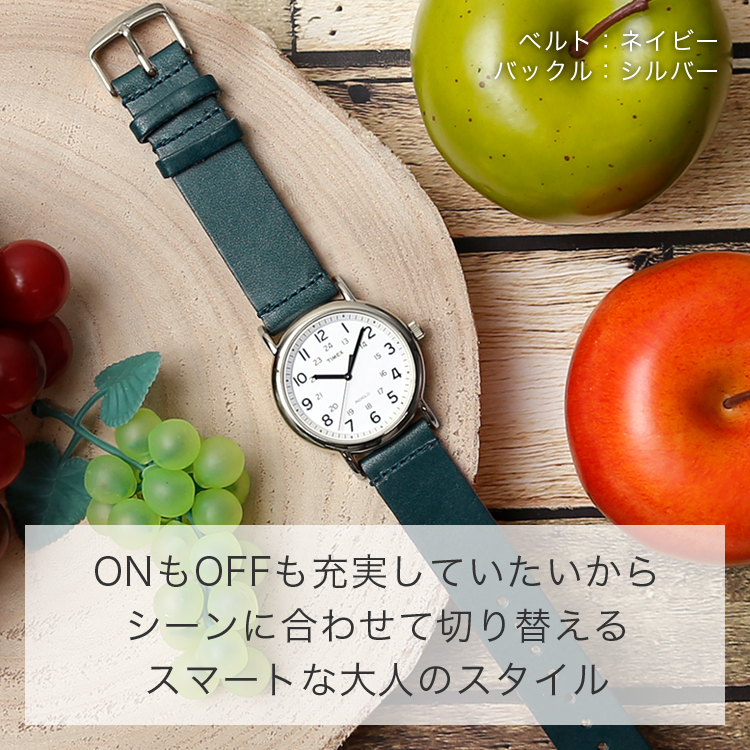 - 前回は、バンドは、オリーブ。 バックルは、ゴールドの組み合わせでした。 使い込むうちに良い色合いになりましたが… やはり皮バンドの宿命で穴が広がり、バックルの固定皮が切れたので今回の購入に至りました。 今回は、バンドは、ネイビー。 バックルは、ブラックとしましたが、 中々どうして!夏に向けて良い感じ…。 今回も、使い込む事での色合いの変化を 楽しみたいと思います。 時計への固定軸の長さが微妙に短かったので、 1、2mm長い軸も付属して欲しいです。