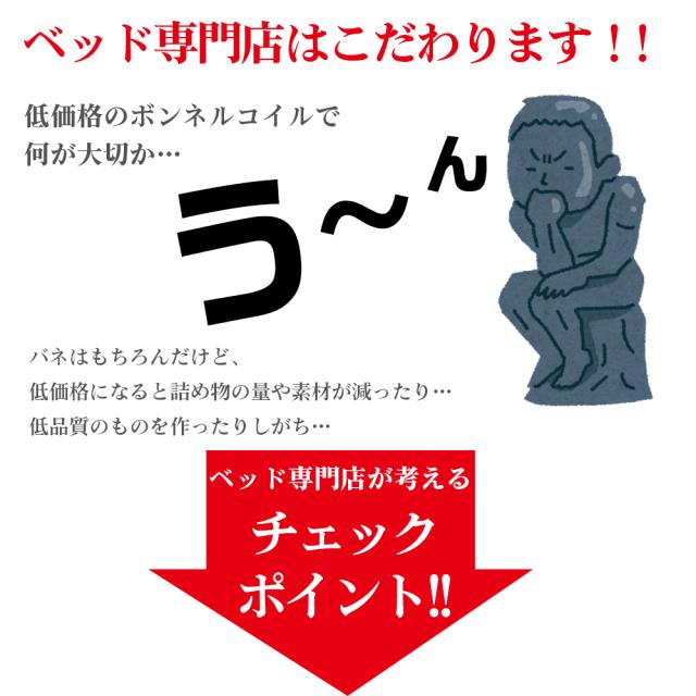 - 今まで布団で寝てて、ついにベッド生活に。 スプリングを調べ耐久性を考慮してポケットでなく、 ボンネルに。お手頃ですが、肌触りも良く、今のところ満足しています。