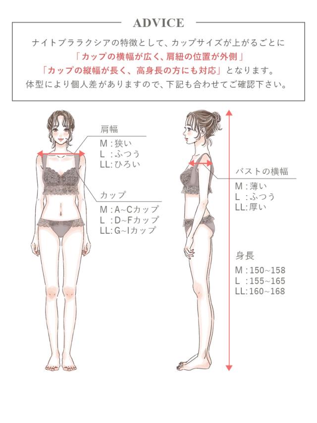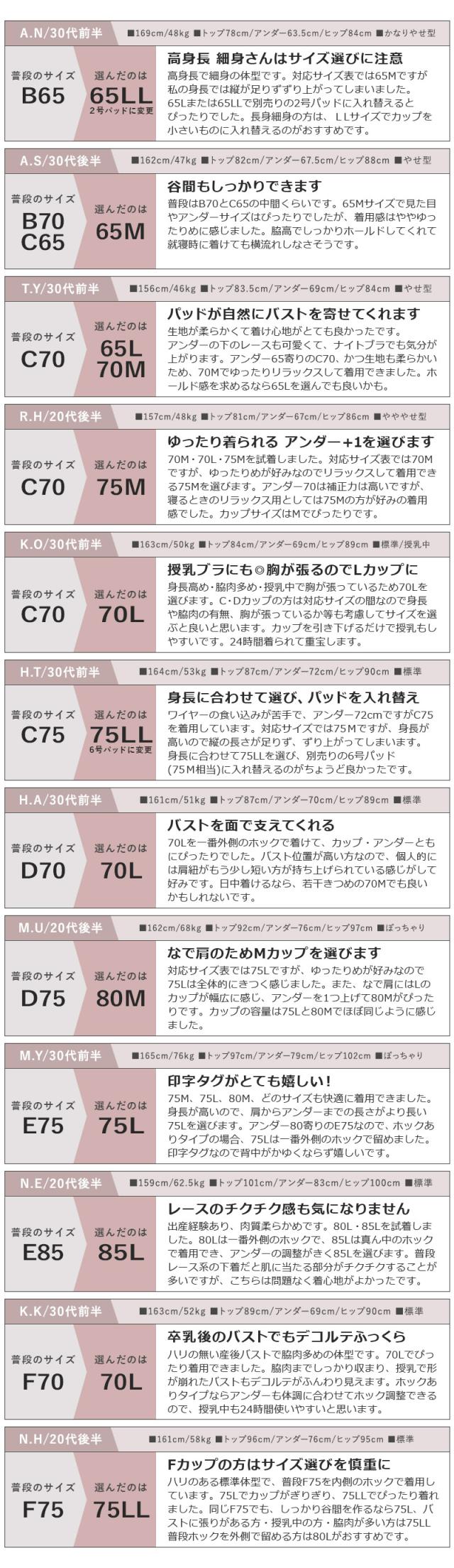 - 購入2回目です。ナイトブラと昼間に使い分けようと思っています。昼間用はしっかり支えたいのでアンダーをひとつ下にするのもいいと思います。