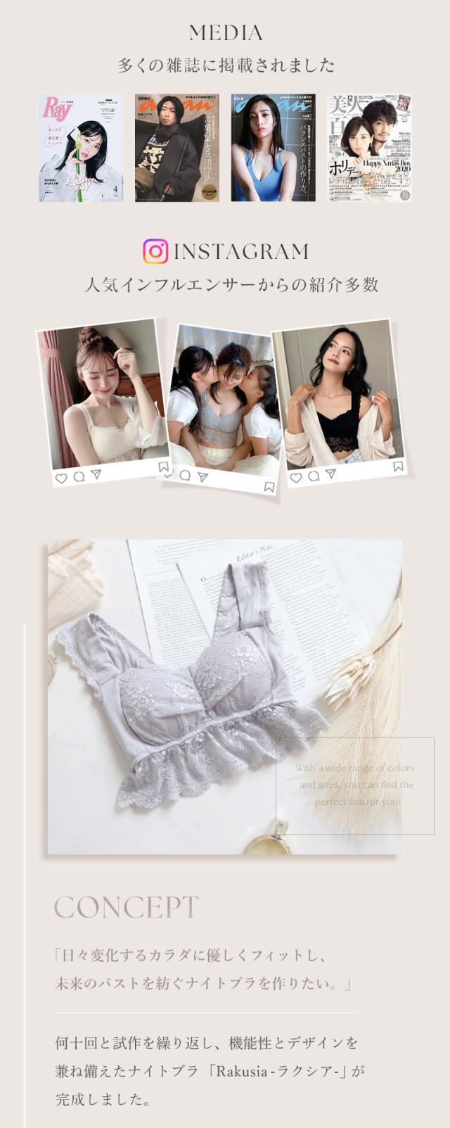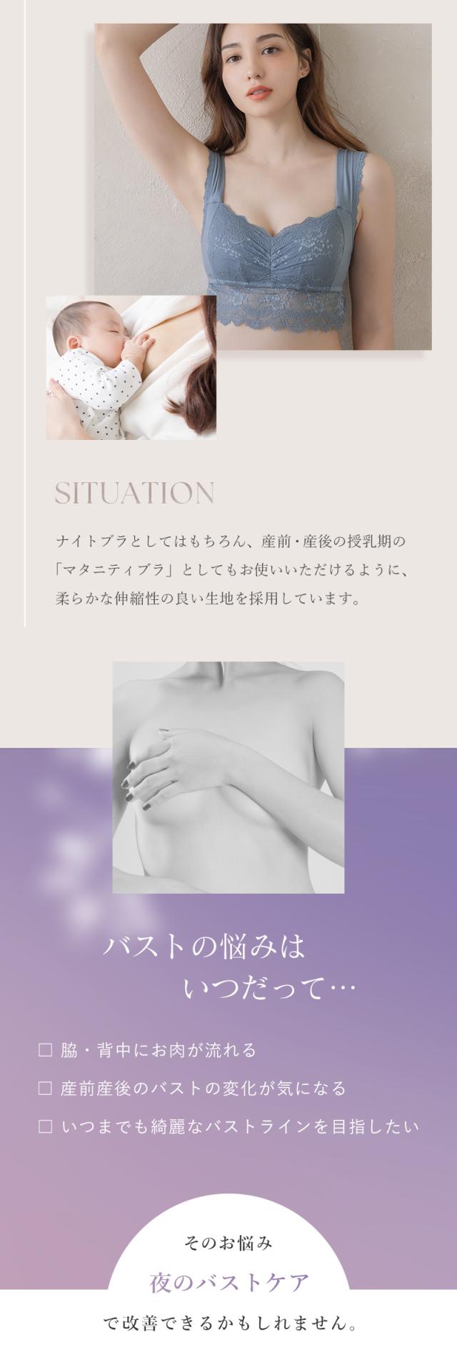 | バストの横流れを予防し、理想の位置にキープ。 ノンワイヤーでもホールド力が高く、寝ている間も快適でソフトな着け心地にこだわったナイトブラ。 ナイトブラとしてはもちろん、マタニティブラや休日のリラックスブラとしてもお使いいただけます。 ■こんな方におすすめ ・バストの下垂が気になる ・脇や背中にお肉が流れる ・手軽にバストケアをしたい ・フィットするナイトブラに出会えていない ・窮屈な下着が苦手 ・産前産後のバストの変化が気になる ・おしゃれなナイトブラが欲しい 〜授乳ブラ・マタニティブラにも〜 縦横に伸縮するので、カップを下げての授乳も可能。 マタニティ期のデリケートなお肌にもご利用いただけます。 マタニティフォト用の衣装としても人気◎ ■特徴 ・カップ横にパワーネットを設置。バストの横流れを防ぎ、寝返り等の揺れから守ります ・バストを「まるごと」包み込むハンド型パッド採用 ・幅広ストラップで肩への負担を軽減。ラクな着け心地 ・工場との直接生産だからこそ実現できたこだわりの価格とクオリティー ・フラワーレースを贅沢に使用したリッチなデザイン \\好みのデザインを2タイプから選べます// ・ホック有り×アンダーレース有りタイプ…好みや体調にあわせフィット感を調整したい方、リッチなデザインがお好きな方 ・ホック無し×アンダーレース無しタイプ…ホックが苦手な方や、ヘルシーなデザインがお好きな方 |
