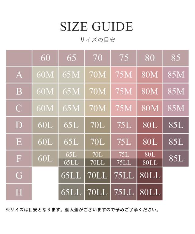 | 60M 65M 60L 65L 65LL 70M 70L 70LL 75M 75L 75LL 80M 80L 80LL 85M 85L ※60M/60Lはティントピンク、チャコールグレー、アイボリーのみの展開となります。 《対応サイズ目安》 60M:A60 B60 C60 65M:A65 B65 C65 60L:D60 E60 F60 65L:D65 E65 F65 65LL:F65 G65 H65 70M:A70 B70 C70 70L:D70 E70 F70 70LL:F70 G70 H70 75M:A75 B75 C75 75L:D75 E75 F75 75LL:F75 G75 H75 80M:A80 B80 C80 80L:D80 E80 F80 80LL:F80 G80 H80 85M:A85 B85 C85 85L:D85 E85 F85 ※対応サイズは目安となります。詳細は[サイズの目安]の画像をご確認ください。 |
