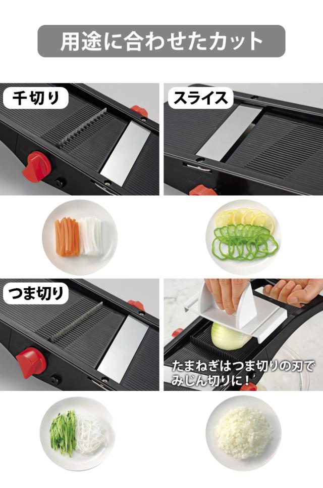 - 大量にスライスする際は非常に便利です。 大きさも良く、切れ味も良いです。 ただ、少量だど後片付けや最後に残る分など考えると非効率なのでちょっと使いにはむいていないですね。