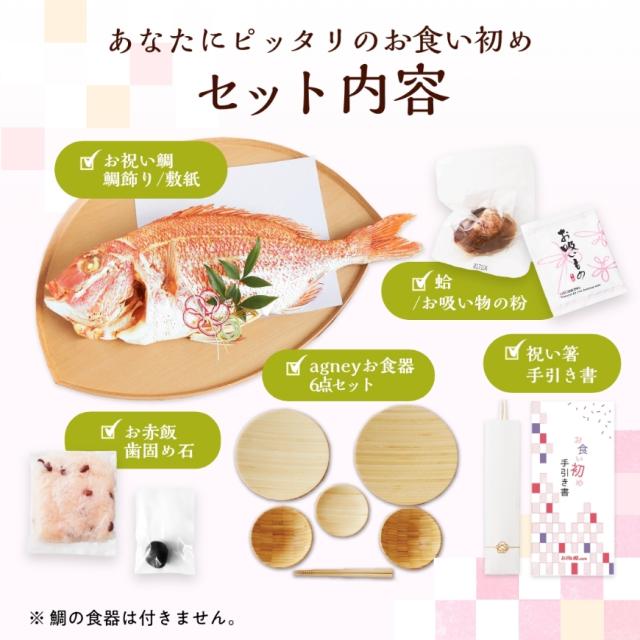 | 内容量 | ●祝い鯛姿焼き(水揚げ時加工前1.5kg / 下処理焼き加工後800g)×1 ●お赤飯×1 ●蛤×1 ●お吸い物の素×1 ●歯固めの石×1 ●祝い箸×1 ●鯛飾り×1 ●敷き紙(白)×1 ●agneyお食い初め食器セット(お椀(φ10×高さ 5cm 容量約120ml) ×2、お皿×3( 直径18・16・9cm)お箸×1膳 (16.5cm)) ギフトボックス入(サイズ:34×25×H8cm 重さ:約740g) |