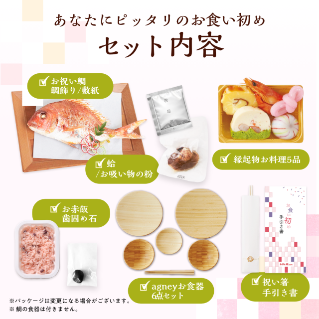 | 原産地・原材料 | ●鯛:真鯛、塩(※季節や漁獲量によっては異なる調味料[酒、醤油、穀物酢、ベニコウジ色素、(原材料の一部に大豆、小麦を含む)]を使用する場合がございます) ●縁起物お料理5品:別資料参照 ●赤飯[小豆]:もち米(国産)、小豆(国産)、食塩、着色料 ●赤飯[甘納豆]:もち米(国産)、甘納豆[砂糖、小豆(国産)、還元水飴]、食塩、着色料 ●蛤:千葉県九十九里産はまぐり1粒約35g ●お吸い物の素(パッケージ白):食塩、麩、ねぎ、のり、調味料(アミノ酸等)、香料 ●お吸い物の素(パッケージ銀):調味顆粒(食塩、乳糖、砂糖、昆布粉末、粉末醤油、昆布エキスパウダー、調味エキス、かつお節粉末)(国内製造)、ふ、乾燥ねぎ/調味料(アミノ酸等)、酸化デンプン、サイクロデキストリン【乳成分・小麦・大豆】 ※吸い物はパッケージ白、銀どちらかお届けいたします。 ●歯固め石:新那智黒石(自然玉)磨きタイプ 約3〜4cm ※天然石の為大きさや形に個体差があります。 ●祝箸:【箸袋】無蛍光奉書/【箸】国産柳 ●agneyお食い初め食器セット:天然孟宗竹(表面ウレタン塗装(食品衛生基準適合の日本製塗料を使用) |