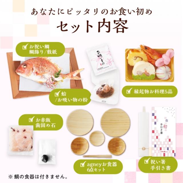 | 原産地・原材料 | ●鯛:真鯛、塩(※季節や漁獲量によっては異なる調味料[酒、醤油、穀物酢、ベニコウジ色素、(原材料の一部に大豆、小麦を含む)]を使用する場合がございます) ●縁起物お料理5品:別資料参照 ●赤飯[小豆]:もち米(国産)、小豆(国産)、食塩、着色料 ●赤飯[甘納豆]:もち米(国産)、甘納豆[砂糖、小豆(国産)、還元水飴]、食塩、着色料 ●蛤:千葉県九十九里産はまぐり1粒約35g ●お吸い物:約2.5g、食塩、麩、ねぎ、のり、調味料(アミノ酸等)、香料 ●歯固め石:新那智黒石(自然玉)磨きタイプ 約3〜4cm ※天然石の為大きさや形に個体差があります。 ●祝箸:【箸袋】無蛍光奉書/【箸】国産柳 ●agneyお食い初め食器セット:天然孟宗竹(表面ウレタン塗装(食品衛生基準適合の日本製塗料を使用) |