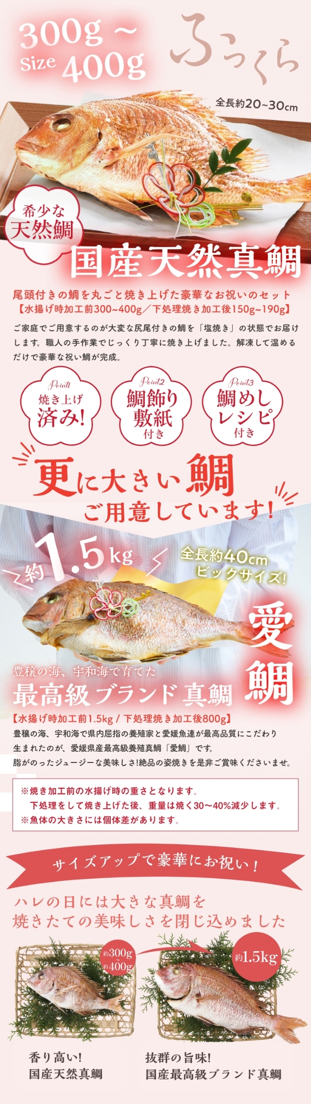 | 内容量 | ●祝い鯛姿焼き(水揚げ時加工前1.5kg / 下処理焼き加工後800g)×1 ●縁起物お料理5品×1 ●お赤飯×1 ●蛤×1 ●お吸い物の素×1 ●歯固めの石×1 ●祝い箸×1 ●鯛飾り×1 ●敷き紙(白)×1 ●agneyお食い初め食器セット(お椀(φ10×高さ 5cm 容量約120ml) ×2、お皿×3( 直径18・16・9cm)お箸×1膳 (16.5cm) ギフトボックス入(サイズ:34×25×H8cm 重さ:約740g) |