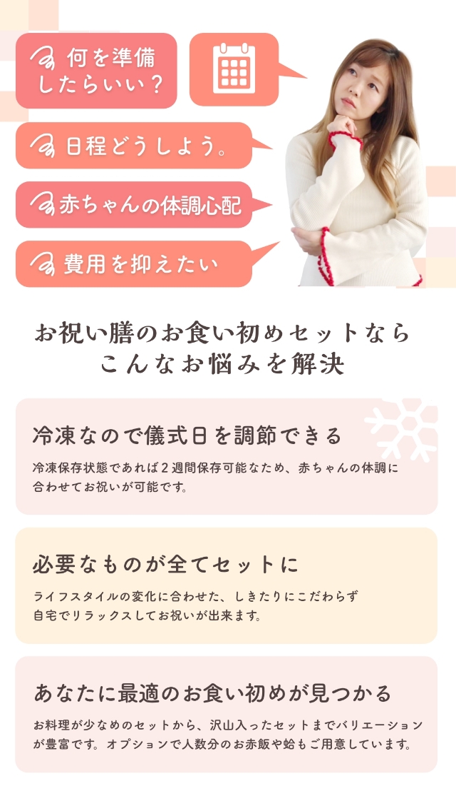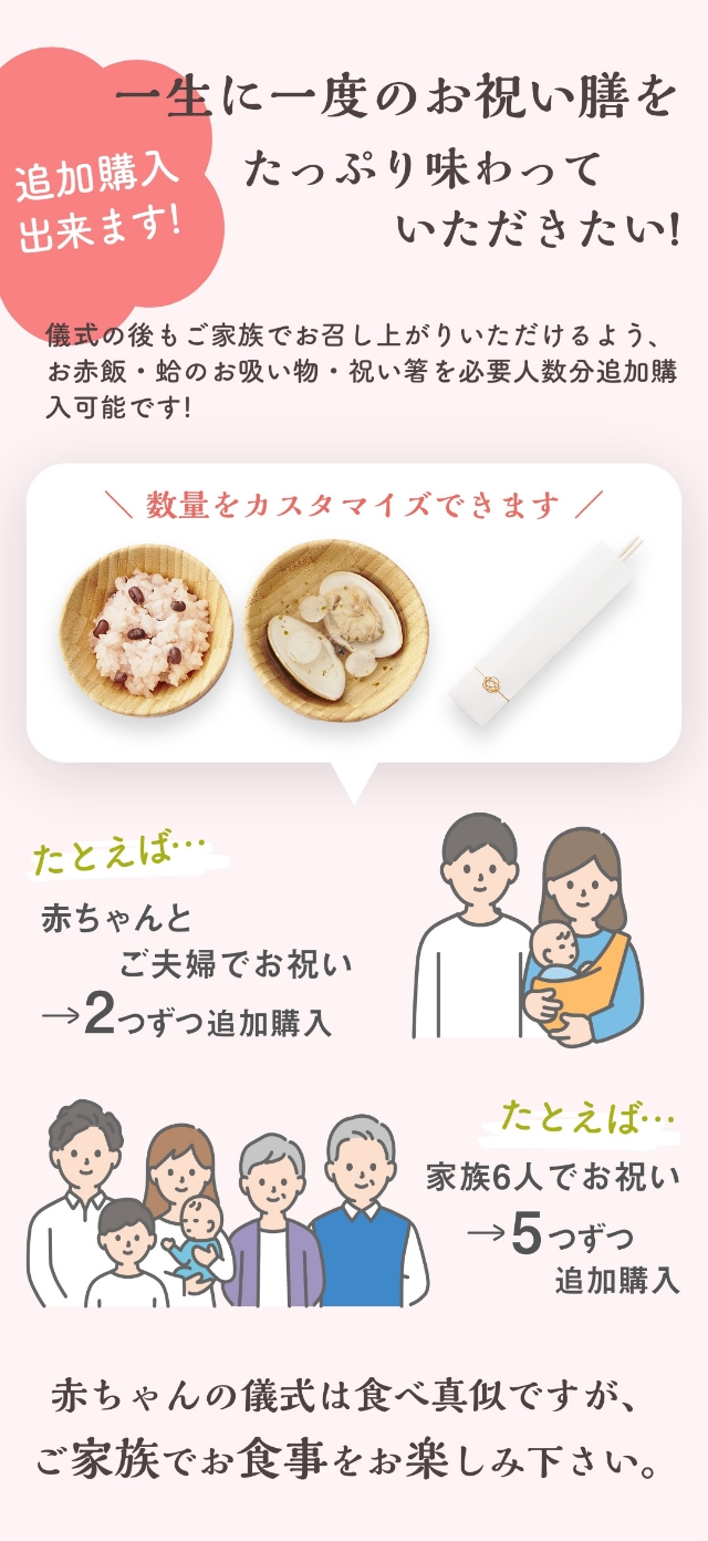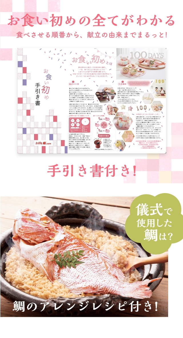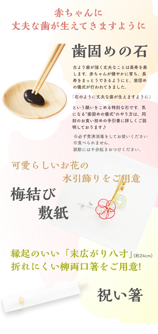 儀式の手順などを詳しく解説した手引き書も付いているので、初めてのお食い初めでも安心です。