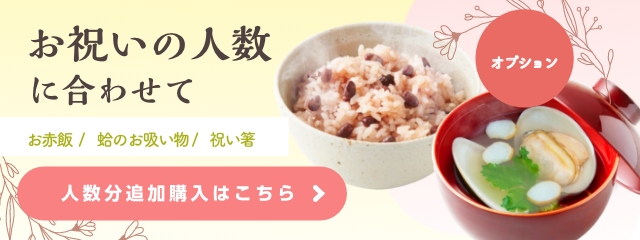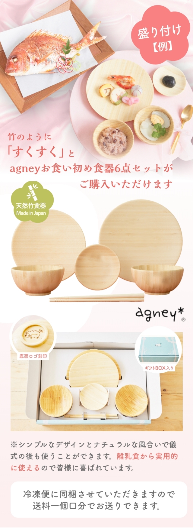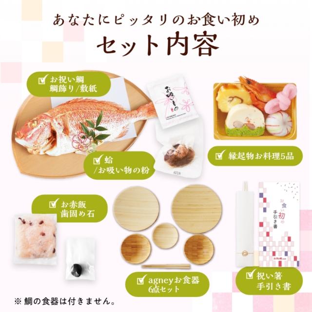 | 原材料 | ●鯛:愛媛県宇和海産養殖真鯛、食塩 ●縁起物お料理5品:別資料参照 ●赤飯[小豆]:もち米(国産)、小豆(国産)、食塩、着色料 ●赤飯[甘納豆]:もち米(国産)、甘納豆[砂糖、小豆(国産)、還元水飴]、食塩、着色料 ●蛤:千葉県九十九里産はまぐり1粒約35g ●お吸い物:約2.5g、食塩、麩、ねぎ、のり、調味料(アミノ酸等)、香料 ●歯固め石:新那智黒石(自然玉)磨きタイプ 約3〜4cm ※天然石の為大きさや形に個体差があります。 ●祝箸:【箸袋】無蛍光奉書/【箸】国産柳 ●agneyお食い初め食器セット:天然孟宗竹(表面ウレタン塗装(食品衛生基準適合の日本製塗料を使用) |