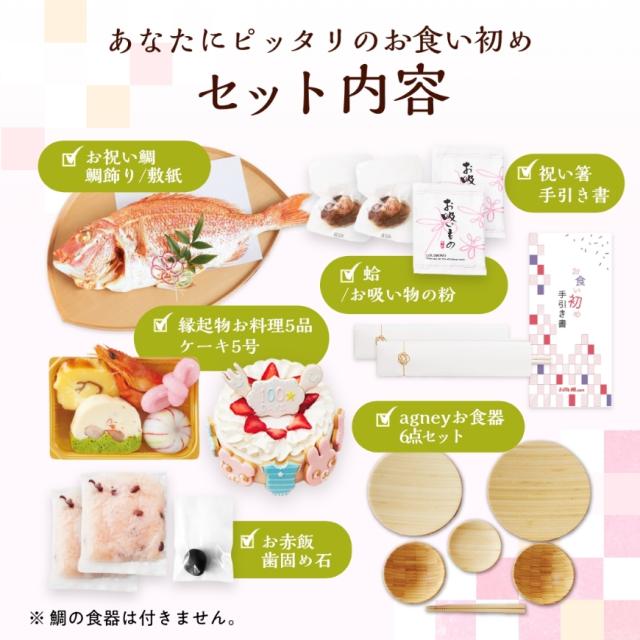 | 内容量 | ●祝い鯛姿焼き(水揚げ時加工前1.5kg / 下処理焼き加工後800g)×1 ●縁起物お料理5品×1 ●お赤飯×2 ●蛤×2 ●お吸い物の素×2 ●歯固めの石×1 ●祝い箸×2 ●鯛飾り×1 ●敷き紙(白)×1 ●生クリーム5号ケーキ(直径約15cm) ●アイシングクッキー8枚 ●agneyお食い初め食器セット(お椀(φ10×高さ 5cm 容量約120ml) ×2、お皿×3( 直径18・16・9cm)お箸×1膳 (16.5cm)) ギフトボックス入(サイズ:34×25×H8cm 重さ:約740g) |