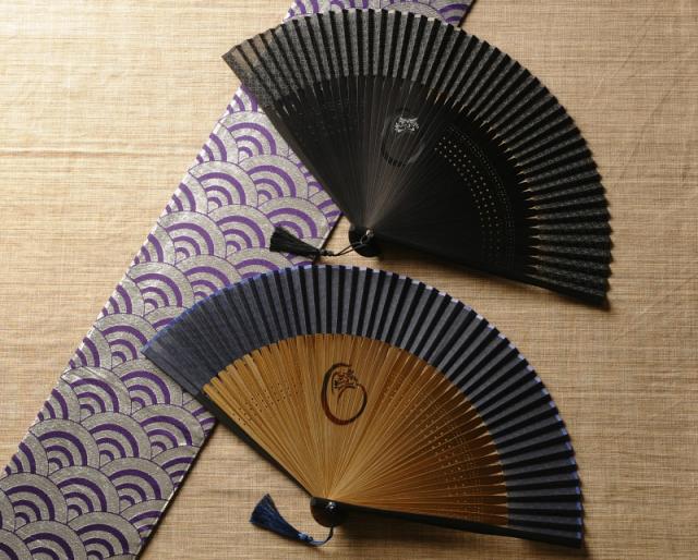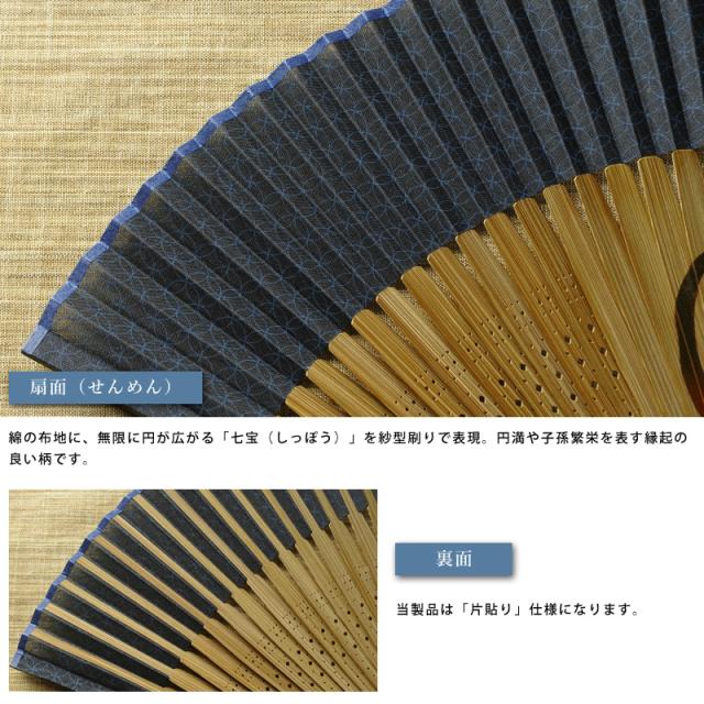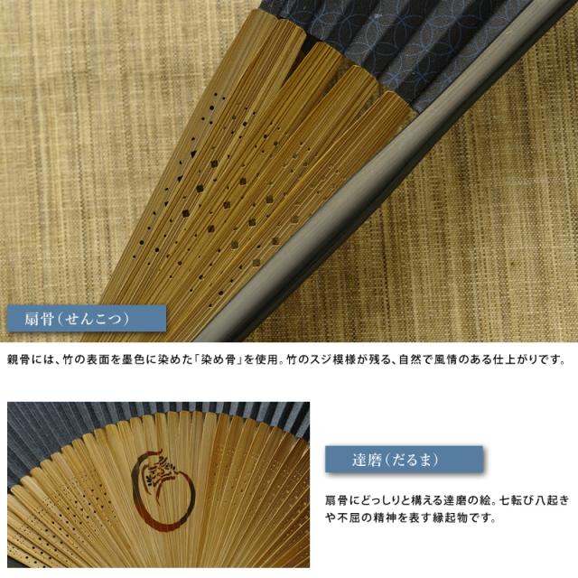 備考:綿の布地に、無限に円が広がる「七宝(しっぽう)」を紗型刷りで表現。円満や子孫繁栄を表す縁起の良い柄です。扇骨には七転び八起きや不屈の精神を表す達磨の絵。2つの縁起物をあしらった、贈り物にもピッタリな紳士用扇子です。