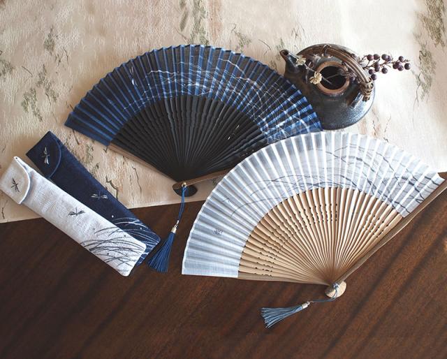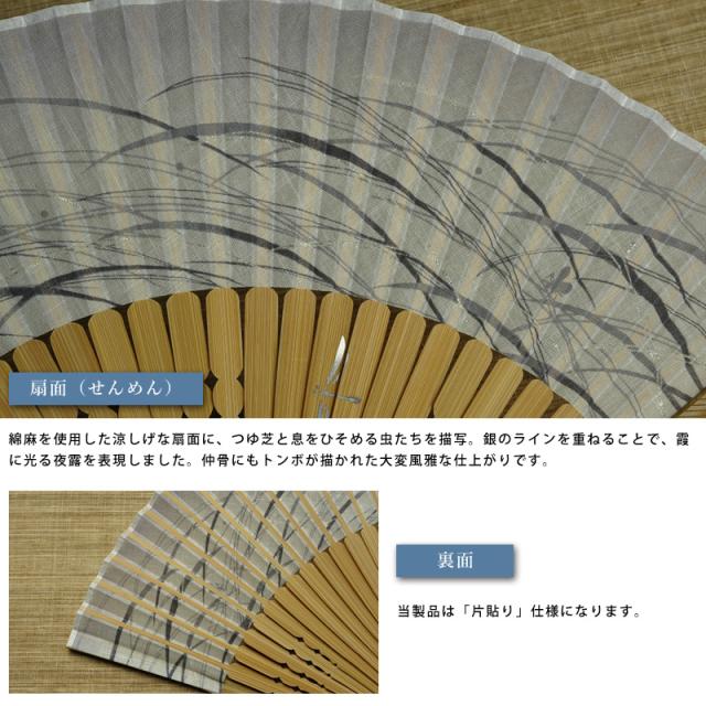 備考:夏の幻想的な瞬間を描写した風情あふれる紳士用扇子。霞の中をほのかに揺れる草花と、その中で息をひそめる虫たち。銀のラインを重ねることで霞に光る夜露を表現し、仲骨にはトンボがふわり。にぎやかな夏の季節にふと訪れる、一瞬の静寂を閉じ込めた逸品です。