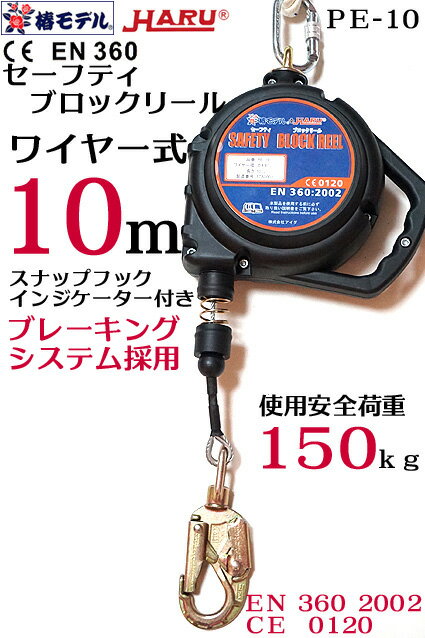 【椿モデル HARU】PE-10セーフティ ブロックリール 10m ワイヤー式 安全ブロック 最大使用荷重 15