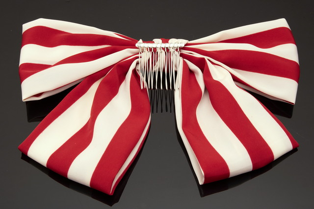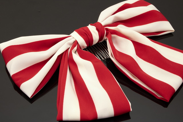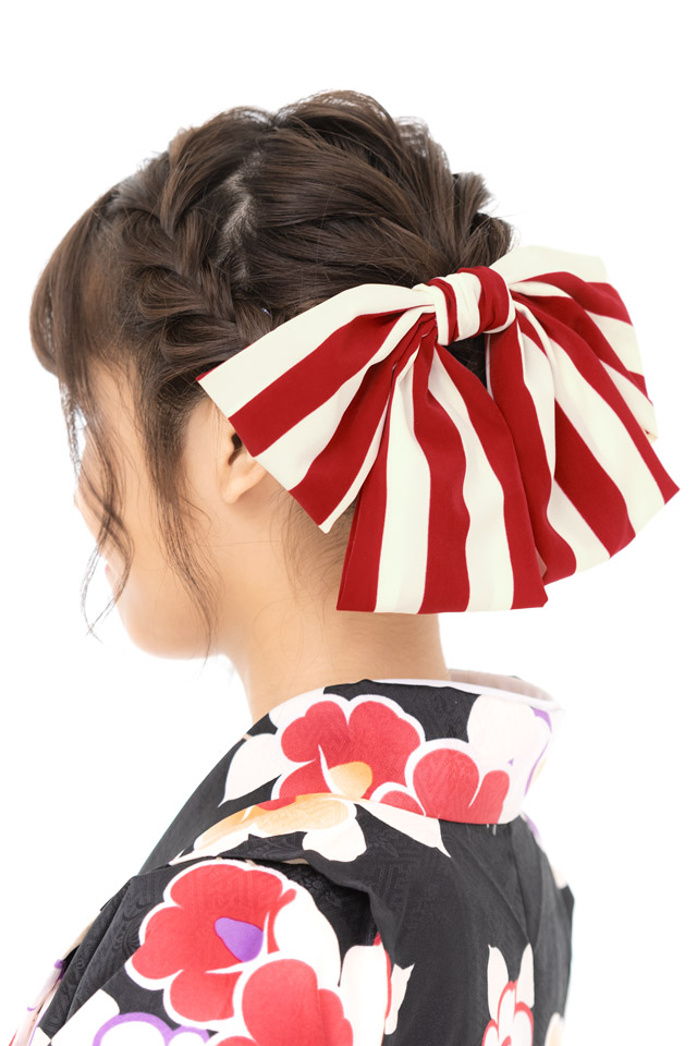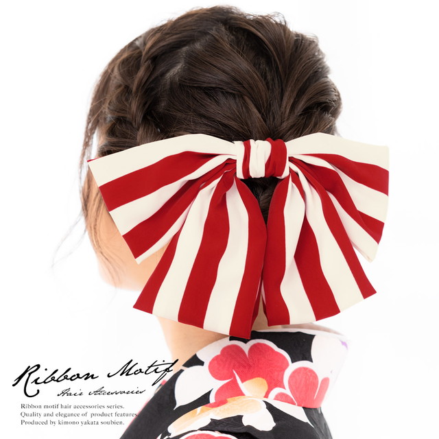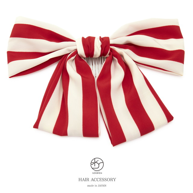 髪飾り リボン 赤 レッド 白 オフホワイト 縞 ストライプ りぼん 和洋兼用 大きめ コーム式 髪留め ヘアアクセサリー 成人式向け 振袖向け 卒業式向け 袴姿 日本製 和装