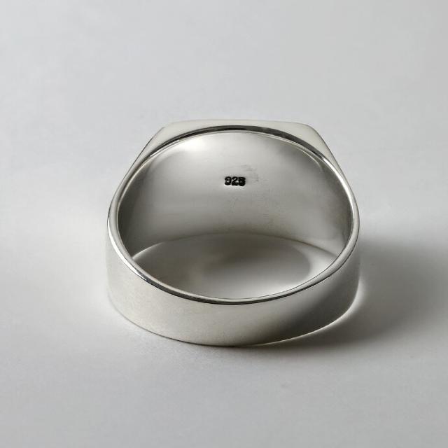 素材・サイズ | 【素材】 シルバー925 【サイズ】 [印台部分] 縦:約12mm [リング腕] 幅:約6mm、厚み:約1mm 重量:約7g(19号計測) |