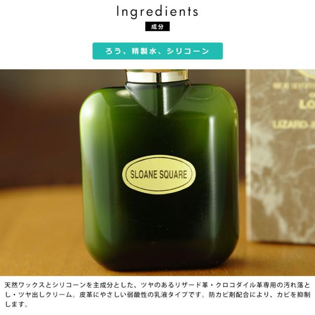 ツヤのあるリザード・クロコダイル革の手あかなどの汚れを取り、ツヤを与えるローションタイプのクリームです。天然ワックスとシリコーンが主成分。皮革にマイルドに作用する弱酸性タイプです。防カビ剤配合。