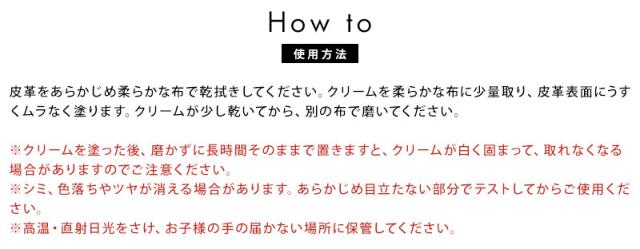 ・クリームを柔らかな布に少量取り、皮革表面に薄くムラなく塗ってください。