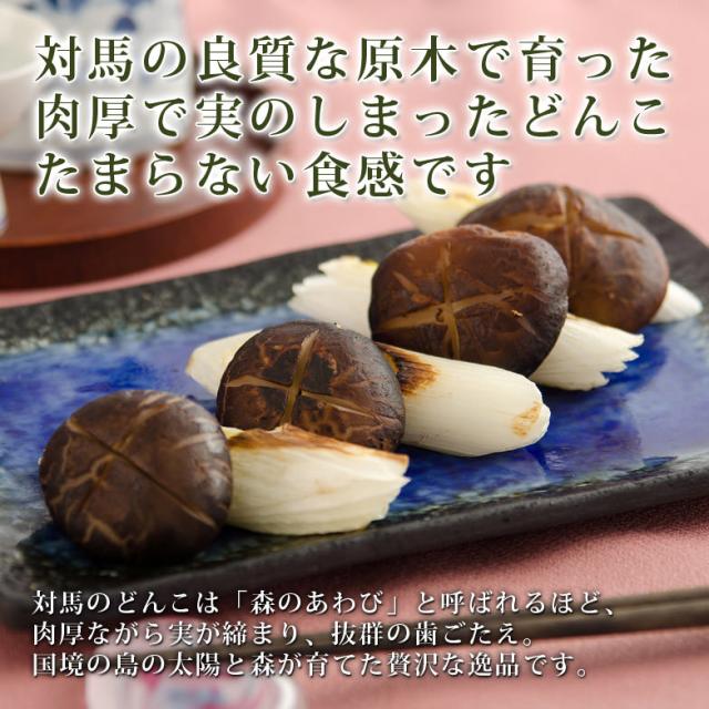 【対馬の良質な原木で育った 肉厚で実のしまったどんこ たまらない食感です】対馬は島の85%が山地で占められています。その山々には、暖流の恩恵を受け、椎茸栽培に最適な良質の原木が育ちます。このため、対馬は古くから日本有数の椎茸の栽培地として知られています。この対馬産の香り高く、歯ごたえ抜群の肉厚な椎茸「どんこ」を干し、さらに旨みと香り、滋養を凝縮しました。ダシをとったり、水で戻して煮物に用いるなど、さまざまなお料理にご活用ください。