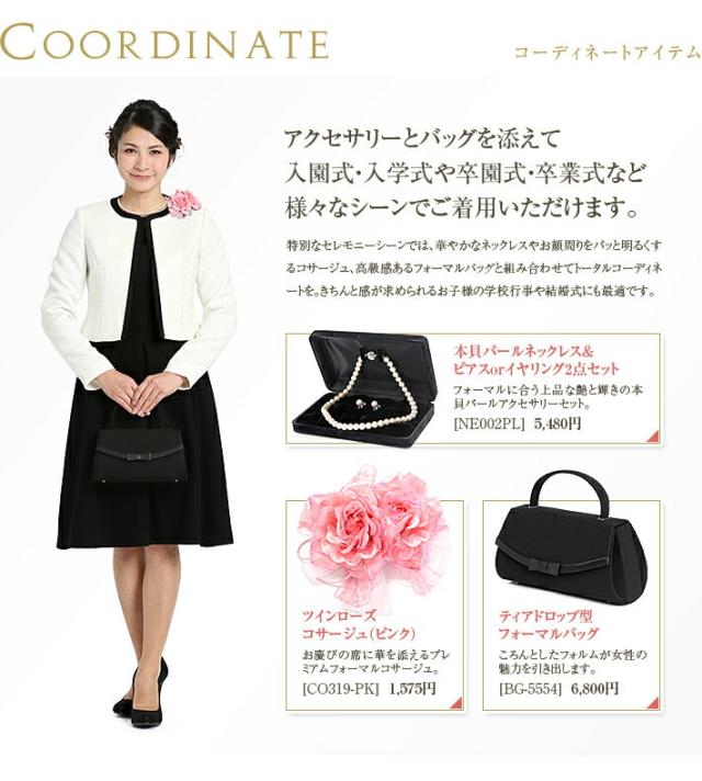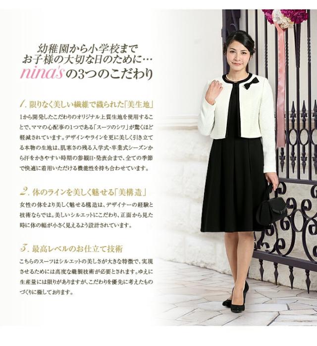 エレガントかつベーシックなデザインなので、お子様の入園式・入学式・七五三はもちろん、華やかなアクセサリーを添えて、結婚式・パーティー・謝恩会などにもご着用いただける、オールマイティな一着です。