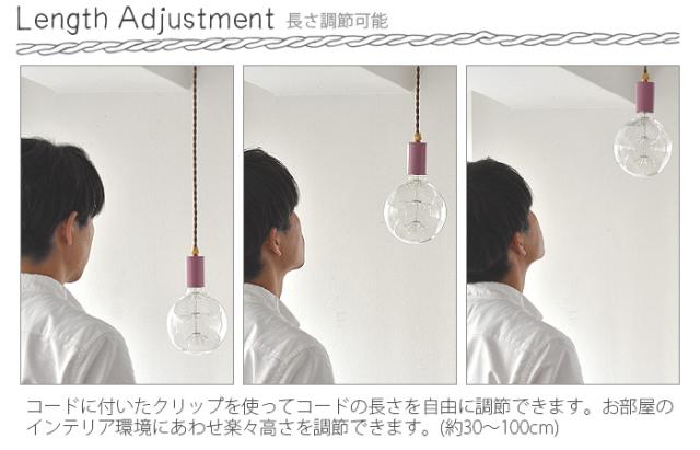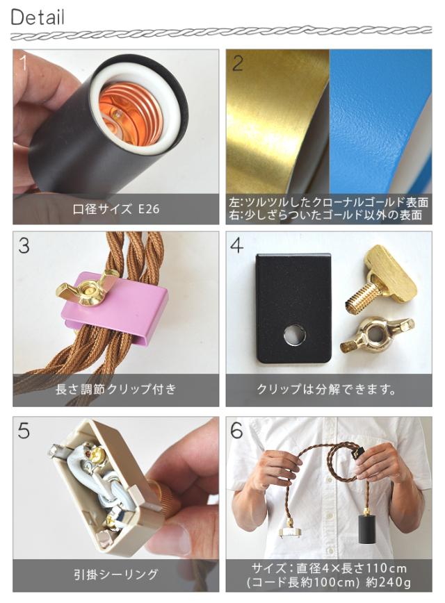 シンプルなデザインのソケットペンダントライトのご案内です。白熱灯、蛍光球、LED球とどのタイプの電球でも使用できます。シェードが付いてないので、電球が主役のミニマルデザインのランプとして使えます。取り付ける電球の形によって表情が変わり、お部屋の模様替えの時や気分によって電球を付け変えるだけで「ついでに」ランプのデザインをお好みに変更できます。ビンテージ調や北欧スタイルなど幅広いインテリアコーディネートにマッチするミニマルなデザインと、全7種類の豊富なカラーバリエーションが魅力的。ポツンと1つで使っても、色違いで複数並べて使ってもオシャレですね。カフェの内装やお店のディスプレイなどに使っていただけば、空間を華やかに演出してくれるアクセントになります。またクローンゴールドは真鍮の素材感の経年変化をお楽しみいただけるように、表面への塗装加工などは一切ほどこしていません。使っていくうちに独特の風合いが増していき自分だけの表情に!プリントが可愛いペーパーバッグ入りでギフトにもおすすめです。コードがお好みの高さに調整(約30〜100cm)できる付属のクリップは、アクセサリーの様で見た目もおしゃれです。クリップは単品の販売もしています。※電球は別売りです。