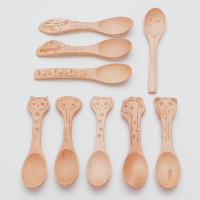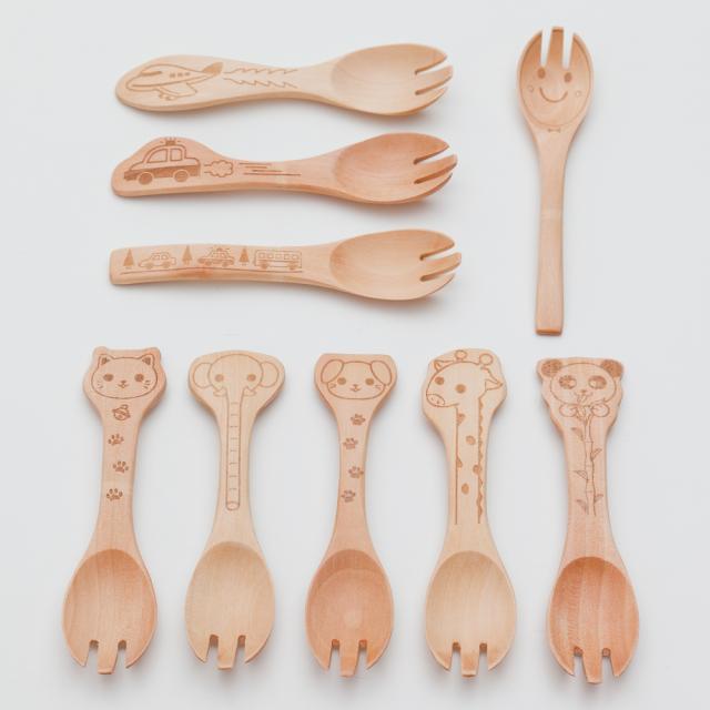 | お子様が大好きな乗り物や動物がスプーンとフォークに大変身!手になじむ天然木の温もり。木のぬくもりと優しさが感じられるお子様用のカトラリーです。木でできているので、見た目より軽く感じられ、お子様にもくちびるに熱くなく、やさしい温かさで接してくれます。木の温もりが感性や情緒を育み、良い影響をあたえてくれる事でしょう。小さい頃から木のカトラリーを使うなんて素敵ですね。スプーン、フォーク9デザインからお選びください。 |
