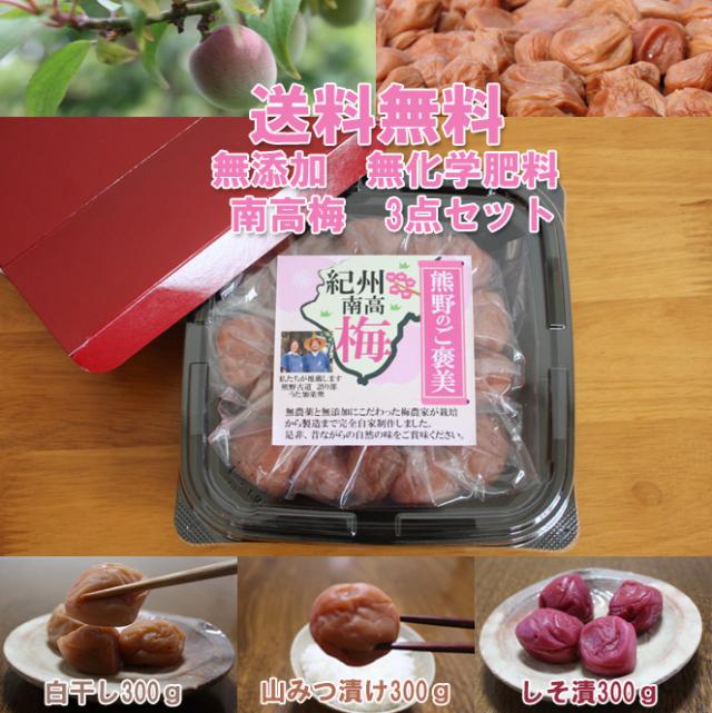送料無料 無添加 梅干し セット 無農薬 南高梅 白干し300g山みつ漬300g紫蘇漬300g 3点セット