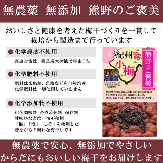 | 無添加 無農薬 無化学肥料 紀州 小梅 ![]() 有機栽培で無農薬と無添加にこだわった梅農家が、栽培から製造まで完全自家制作しました。 ぜひ、昔ながらの自然の味をご賞味下さい。 熊野のご褒美 小梅は、 和歌山県南部の田辺市中芳養の梅農園よりお届けします。 循環型環境農法で、化学農薬、化学肥料は使用せず、 化学調味料、合成着色料、保存料、甘味料などを使わず、 「梅」「塩」「しそ」だけを使用した昔ながらの素朴な梅干しです。 昔ながらの手法にこだわり栽培から製造まで自家制作することで実現できる 自然の味をご賞味ください。 熊野のご褒美 紫蘇(しそ)漬 小梅。 塩漬けした小梅を有機栽培(減農薬)の紫蘇(しそ)に漬込みました。 ※配送につきまして 梅農家より直送、もしくは提携のセンターより発送します。 梅農家から直送の場合は農園作業などと並行して商品梱包・出荷作業を行いますので、お届けまでお時間をいただくことがございます。