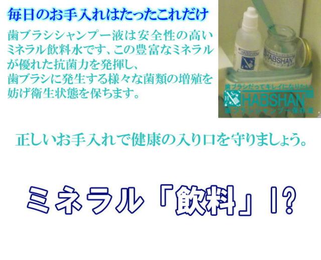 歯ブラシシャンプー液は安全性の高いミネラル飲料水です、この豊富なミネラルが優れた抗菌力を発揮し、歯ブラシに発生する様々な菌類の増殖を妨げ衛生状態を保ちます。