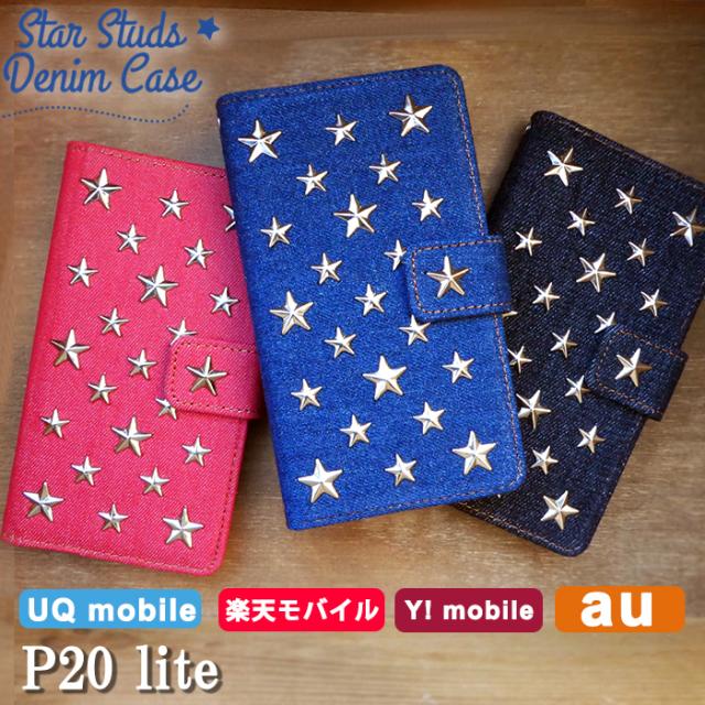 P20lite ケース カバー 手帳 手帳型 HWV32 HWU34 スタースタッズデニム スマホケース スマホカバー HUAWEI ファーウェイ