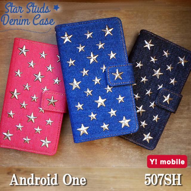 Android One 507SH ケース カバー 手帳 手帳型 スタースタッズデニム スマホケース スマホカバー アンドロイドワン