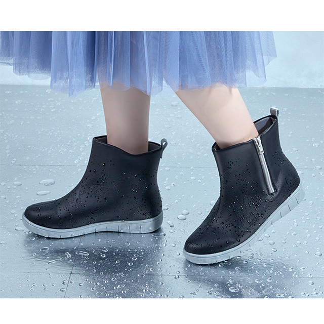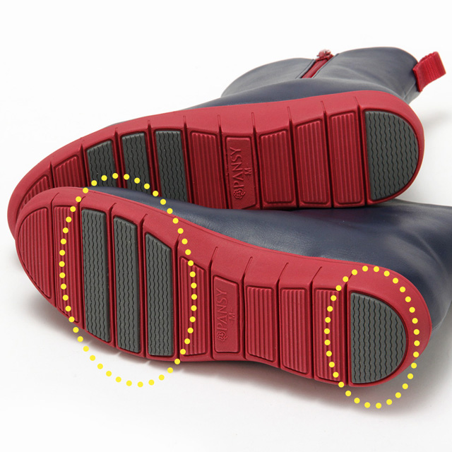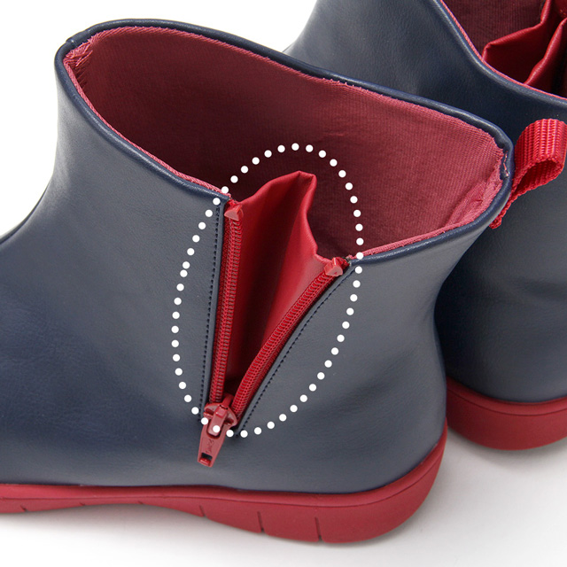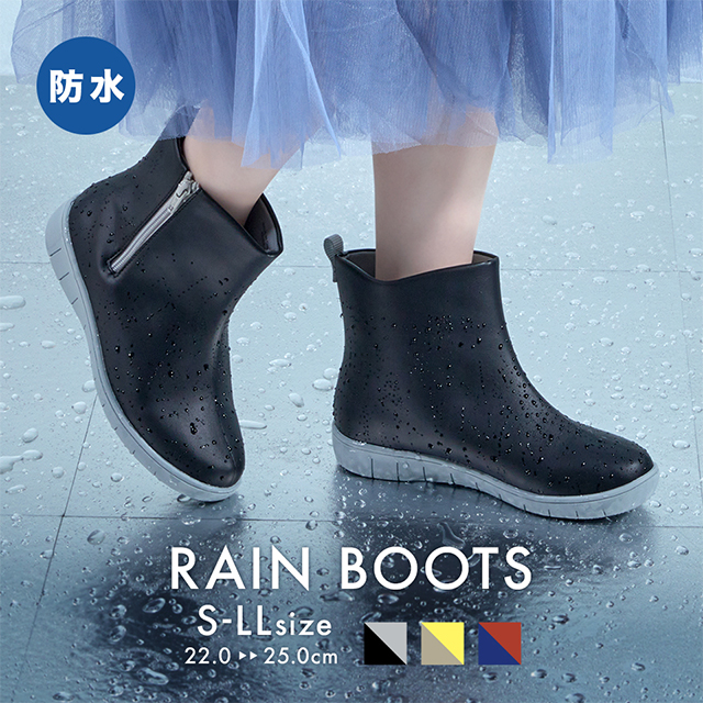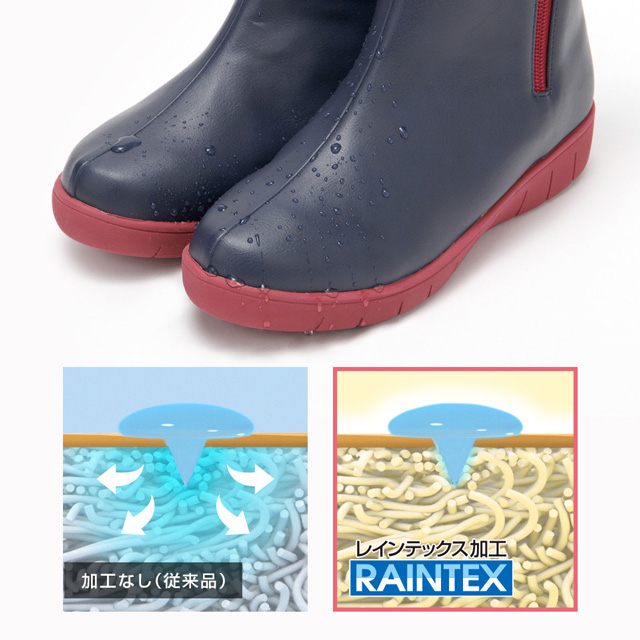 甲表部分に独自の防水技術「レインテックス加工」を施した素材を使用。また、甲部分のパーツを高周波で溶着することにより縫い目から水が浸入することがなく、高い防水性を発揮します。