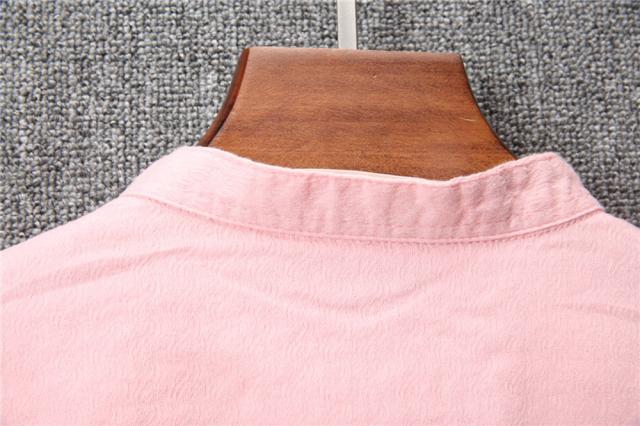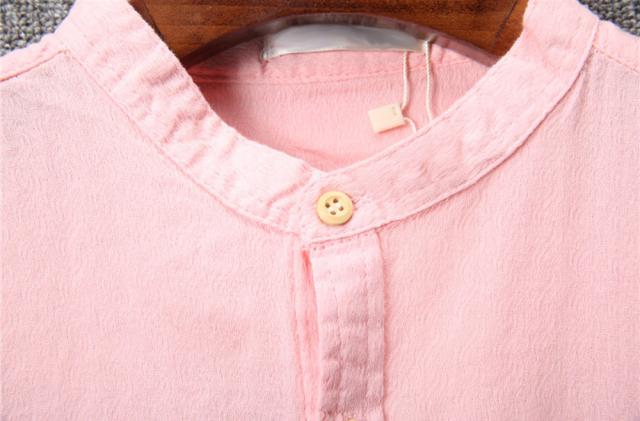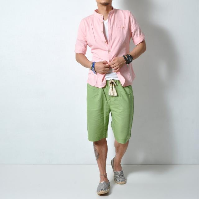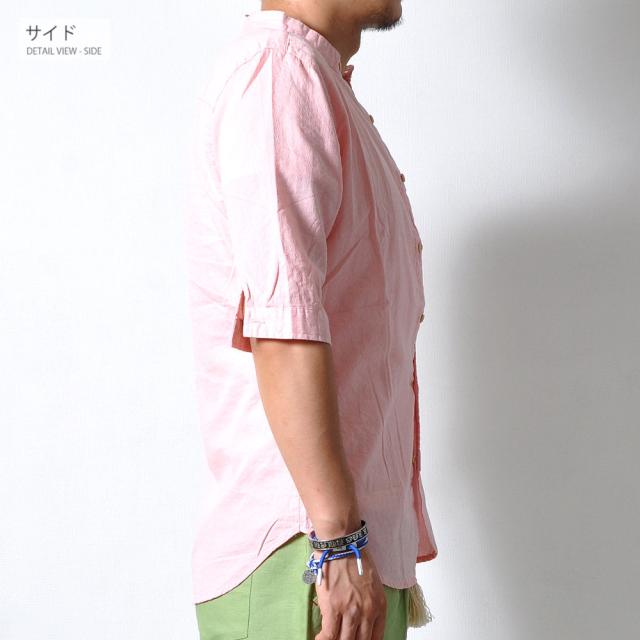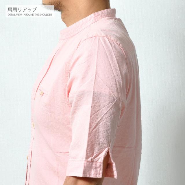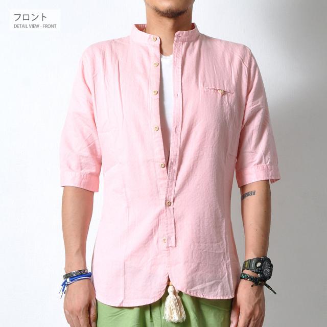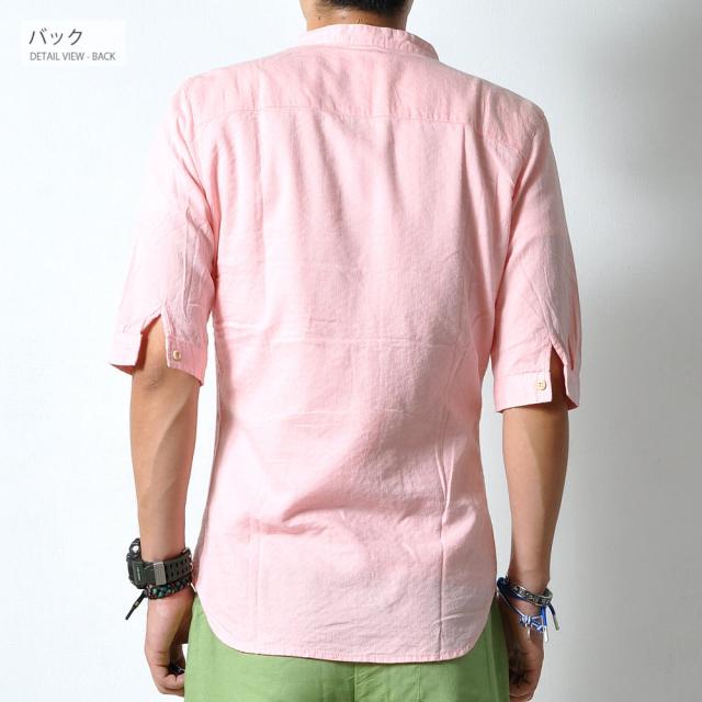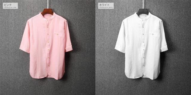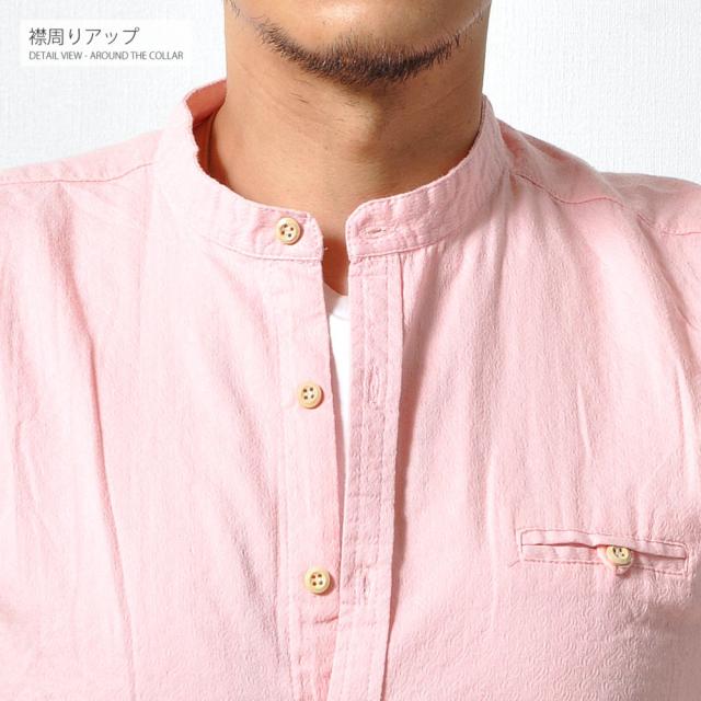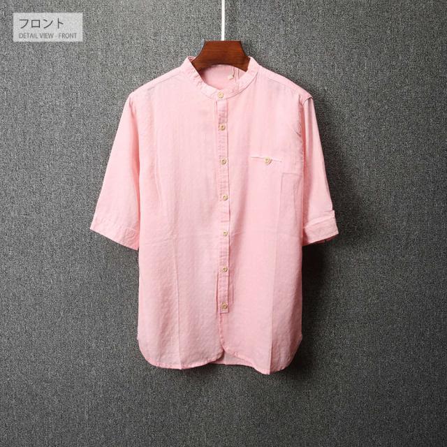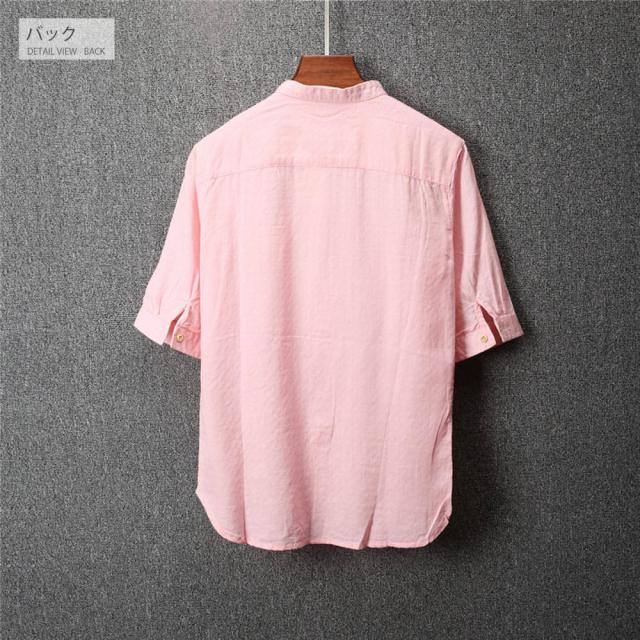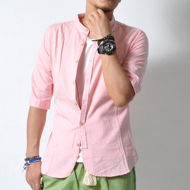 柔らかで適度な伸縮性のある素材の5分袖シャツトレンドのバンドカラー(スタンドカラー)は襟付きでも比較的