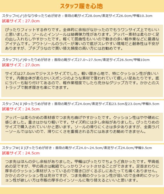 | 素材 | 甲被:合成皮革+ナイロンメッシュ 靴底:EVA+合成底 先芯:樹脂先芯(JIS L級相当) 重量:約330g(26.0cm片足計測) インソール:取外し可 | |||||
