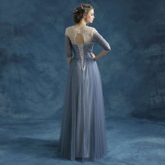 ロングドレス 袖あり 演奏会 パーティードレス イブニングドレス お呼ばれドレス お呼ばれ 発表会 ピアノ コンサート ステージ衣装 音楽会 カラードレス 大きいサイズ マキシ丈 七分袖 Aライン 編み上げ フレア チュール 透け感 ビジュー クルーネック 20代 30代 40代 50代