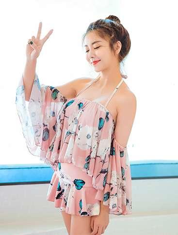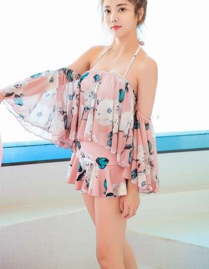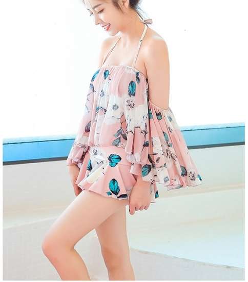 体型カバー 水着 ビキニ 4点セット 大きいサイズ レディース 2019年新作 ビーチウェア 40代 30代 20代 フレアスカート フリル セットアップ オフショルダー ホルターネック 花柄 カバーアップ 着やせ 韓国 ママ水着 オシャレ XL 海 プール ビーチ リゾート