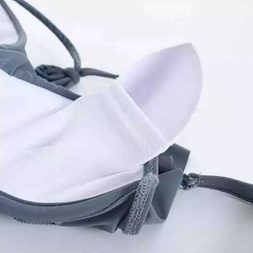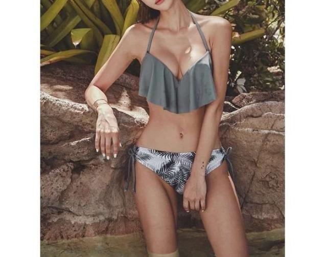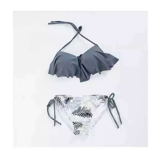 [即納]セクシー 水着 ビキニ ブラジリアン フレアトップ ワイヤー入り パッド入り ボタニカル柄 バンドゥ 紐ビキニ 紐パン ボリュームアップ SEXY 小胸 体型カバー 激安 2点セット フリル レディース 南国リーフ柄 ホルターネック