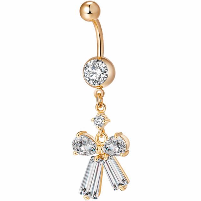 金色の14ゲージのヘソピ型ボディピアスに大きなリボン型のジルコニアチャームが揺れる大人可愛いヘソピアス。揺れるキラキラのリボンの上品なチャームは大人女子からも人気が高くプレゼントにも最適のボディピアス。おへそのピアスとしてはもちろん耳に付けても綺麗な大人のボディピアス。シャフトの素材も安心のサージカルステンレス316L製のバナナバーベル型ボディーピアスは安心。ヘソピアスは人気のピアッシング。ネイブルやナベルリングとも呼ばれる。