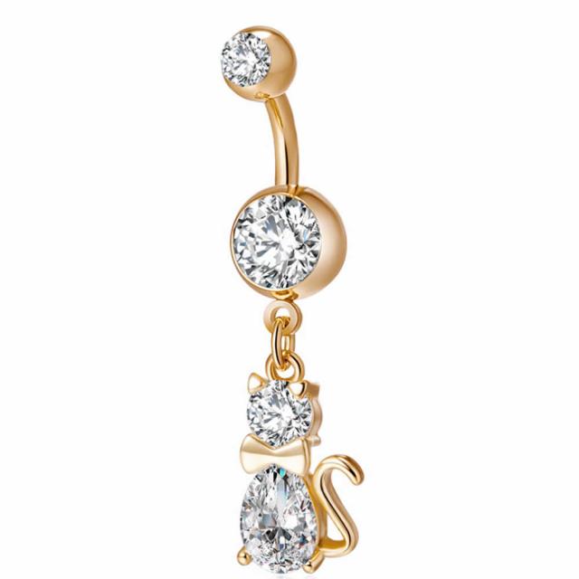 金メッキした14ゲージのカーブバーベル型ボディピアスにクリスタルのジルコニアで猫をデザインしたチャームが揺れる大人可愛いヘソピアス。揺れるネコの可愛いチャームは大人女子からも人気が高くプレゼントにも最適のボディピアス。おへそのピアスとしてはもちろん耳に付けても綺麗な大人のボディピアス。シャフトの素材も安心のサージカルステンレス316L製のバナナバーベル型ボディーピアスは安心。ヘソピアスは人気のピアッシング。ネイブルやナベルリングとも呼ばれる。